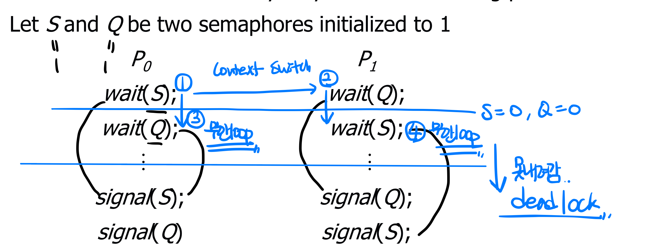 그리고 다시 context switching이 일어나고 P0은 Q자원을 얻기 위해 기다리게 되고 P1은 S자원을 얻기 위해 기다리게 된다.